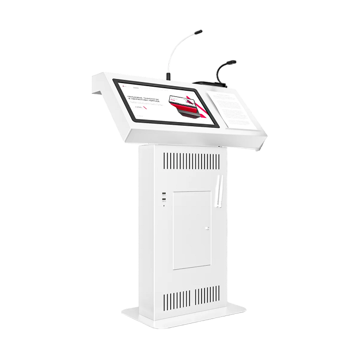 Ультрасовременная модель среди интерактивных трибун, которая включает в себя все самое необходимое для успешного проведения выступлений: профессиональный микрофон для качественной передачи звука, антивандальный корпус, яркий сенсорный экран, документ-камера для отображения необходимых документов на большом экране, дополнительные внешние разъемы. Помимо этого, на трибуне Voice Pro 21,5" предусмотрено место для размещения документов.