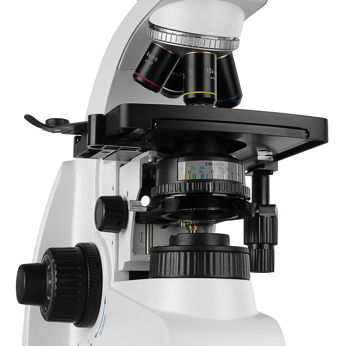 В комплекте микроскопа объективы с коррекцией на бесконечность 4x/0.13, 10x/0.30, 40x/0.70 и иммерсионный объектив 100x/1.25 oil. По дополнительному заказу может быть приобретен объектив 60х/0.80. Высокое оптическое качество объективов обеспечивает информативность и комфорт при исследованиях и отличное качество записываемых изображений. Объективы стандартизованы по DIN и имеют парфокальную высоту 45 мм.