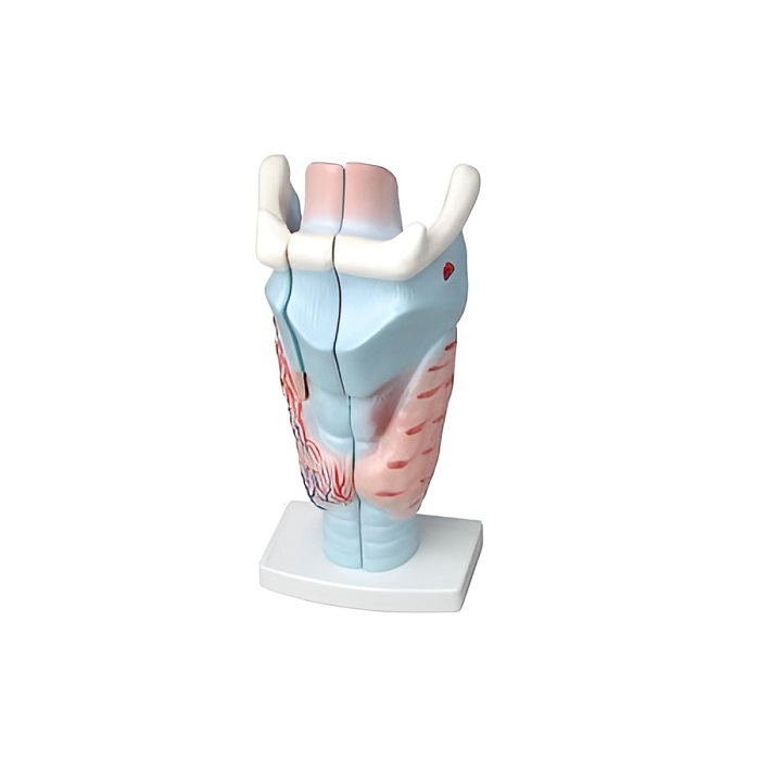 Модель является разборной, изображает сагиттальный разрез гортани человека, демонстрирует ее внутреннее строение. Модель раскрашена.