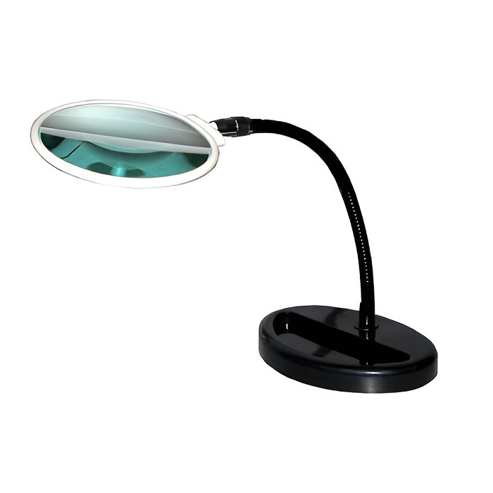 Лупа снабжена подставкой и регулируемым держателем, позволяющим наклонять и фиксировать линзу в нужном положении. В корпус изделия встроена светодиодная подсветка (батарейки в комплект не входят).