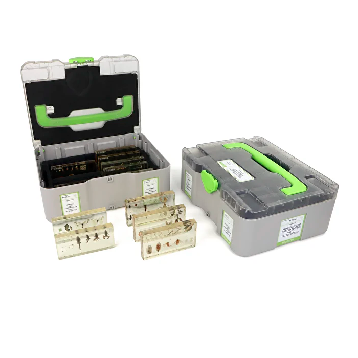В набор входят наглядные образцы в прозрачном пластике: листья, соцветия, водоросли, насекомые, жизненные циклы растений и животных, а также скелеты позвоночных. Все элементы удобно рассортированы в кейсах с ложементами.