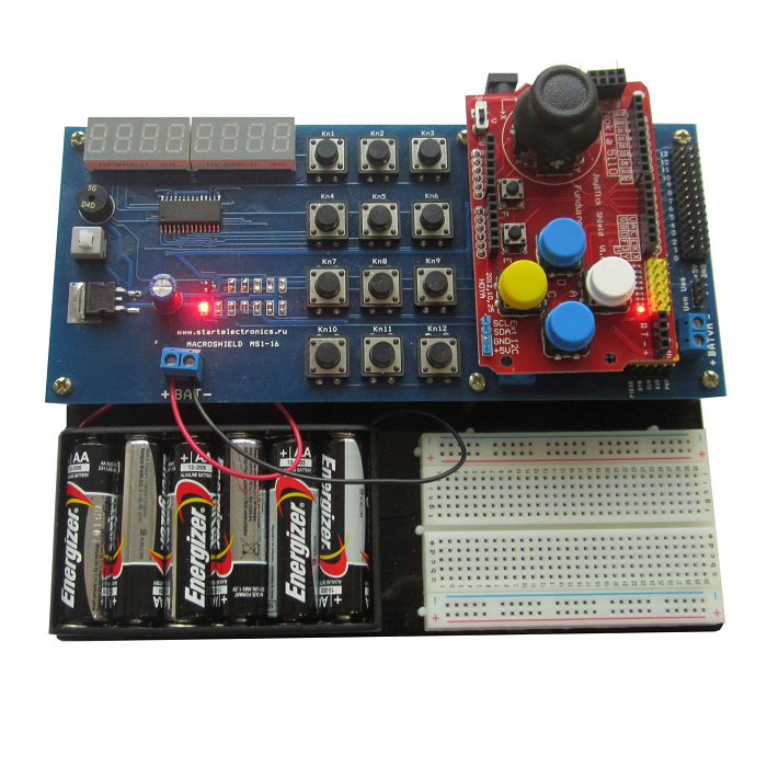 Макетное поле на 400 контактных точек для установки разлиных датчиков, сборки несложных электронных схем.