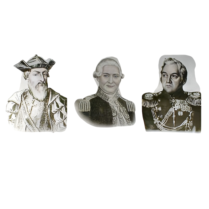 Представляют собой комплект портретов формата А3 в количестве 25 шт., выполненных на качественной белой бумаге. На портретах указаны фамилии (с именами, либо с именами и отчествами) и даты жизни путешественников.