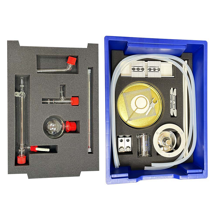 На верхнем уровне пластикового контейнера находятся стеклянные детали для сборки дистиллятора. На нижнем уровне контейнера – комплектующие для сборки штатива и необходимые детали для самостоятельного проведения опытов по дистилляции. Ученики познакомятся с методом разделения и очистки веществ методом дистилляции.