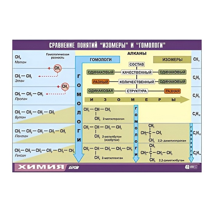 Таблица демонстрационная "Сравнение понятий изомер и гомолог" (винил 100х140)