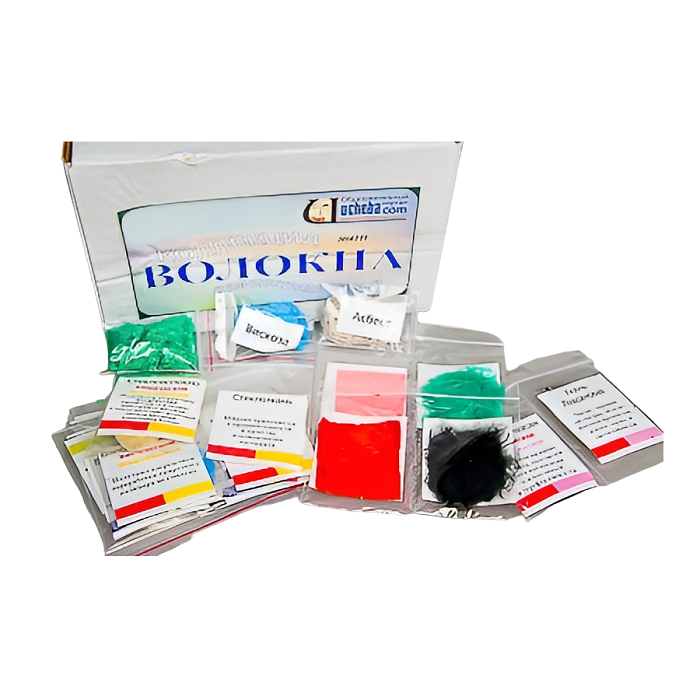 Коллекция включает образцы волокон и изготовленных из них тканей. Образцы разложены в пакеты с этикетками, содержащими название образца, тип волокна и краткую информацию о его свойствах, получении и применении. Также коллекция включает образцы волокон (расфасованы в маленькие пакетики с этикетками), предназначенные для расходования при проведении опытов по идентификации волокон и определении их свойств. Пособие комплектуется руководством по эксплуатации и ламинированным вкладышем, содержащим классификацию волокон, информацию об их свойствах, производстве и применении.