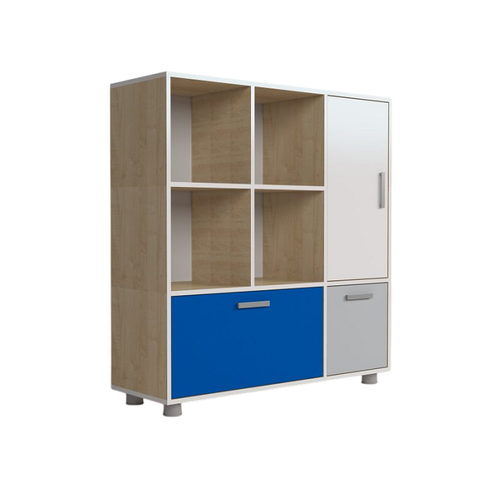 Изделие подойдет для оснащения школьного или офисного кабинета. На полочки можно сложить малогабаритные предметы, книги или элементы декора. Имеется четыре открытые полочки и три закрытых. Нижние закрытые полочки с откидывающимся вниз фасадом на петлях и газлифтами, а верхняя закрытая полка открывается вбок. Ножки изделия выполняются из износоустойчивого и прочного пластика, благодаря этому они не царапают пол и обеспечивают устойчивость модулю.