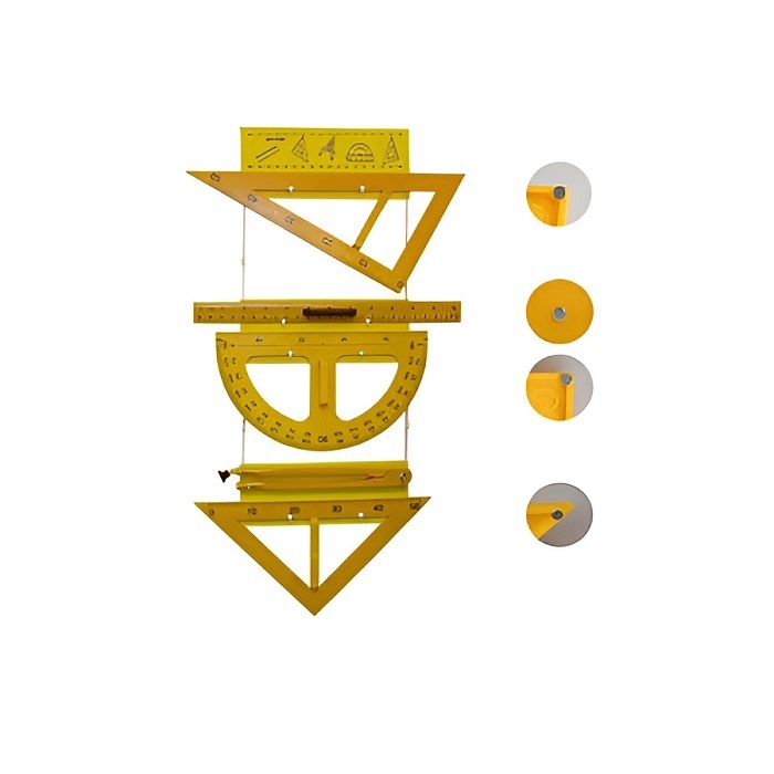 Инструменты изготовлены из пластмассы, снабжены ручками и магнитными держателями для фиксации при черчении и измерении на классной доске. Комплект крепится на стене на пластинах, соединенных между собой гибкой декоративной связью и оснащенных удобными держателями.