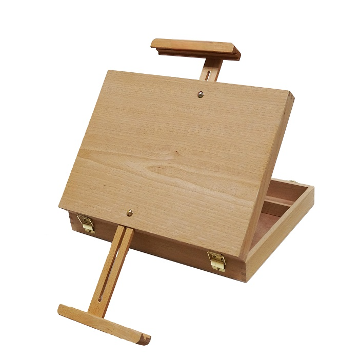 Удобный настольный этюдник сочетает в себе функции мольберта и ящика для хранения кистей и красок. За счет того, что регулируется как верхний бегунок, так и нижняя планка, этот этюдник легко удерживает холсты больших размеров. Выполнен из бука, покрыт лаком.