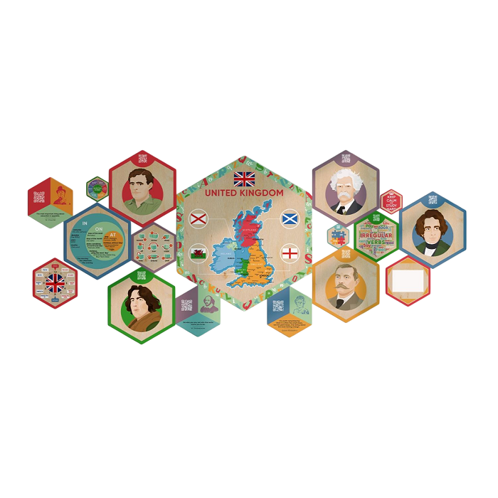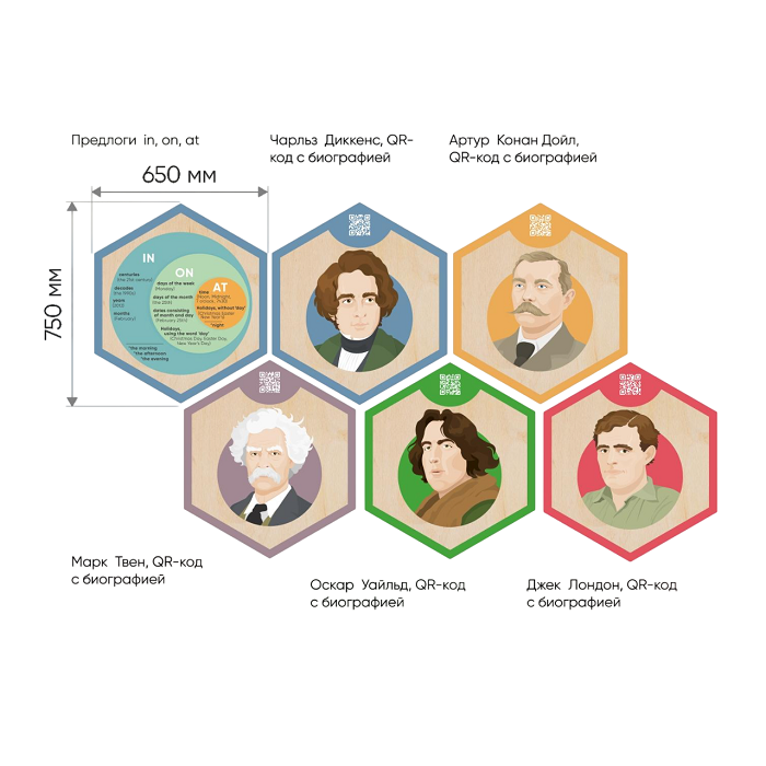 В комплект входит 17 шестигранников разных размеров. Каждый содержит обучающую информацию. Благодаря QR-кодам дети могут подробнее узнать о выдающихся личностях, изображённых на портретах, правила и интересные факты - стоит только навести на них телефон.