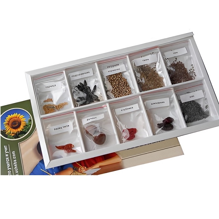 В пособии представлены засушенные плоды сельскохозяйственных растений. Образцы расфасованы в пакеты и снабжены этикетками с названиями растений.