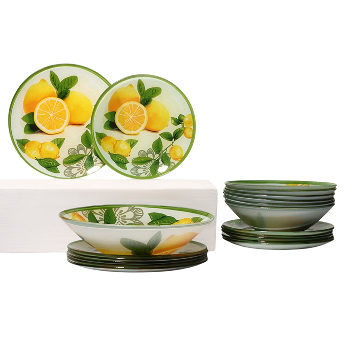 Тарелки изготовлены из качественного стекла, отличаются надежностью и долговечностью. Они не впитывают запахи и легко очищаются. Стильный дизайн позволит использовать тарелки как в повседневной сервировке, так и на праздниках и торжествах. В комплекте 19 предметов: салатник, 6 десертных тарелок, 6 обеденных тарелок, 6 мисок.