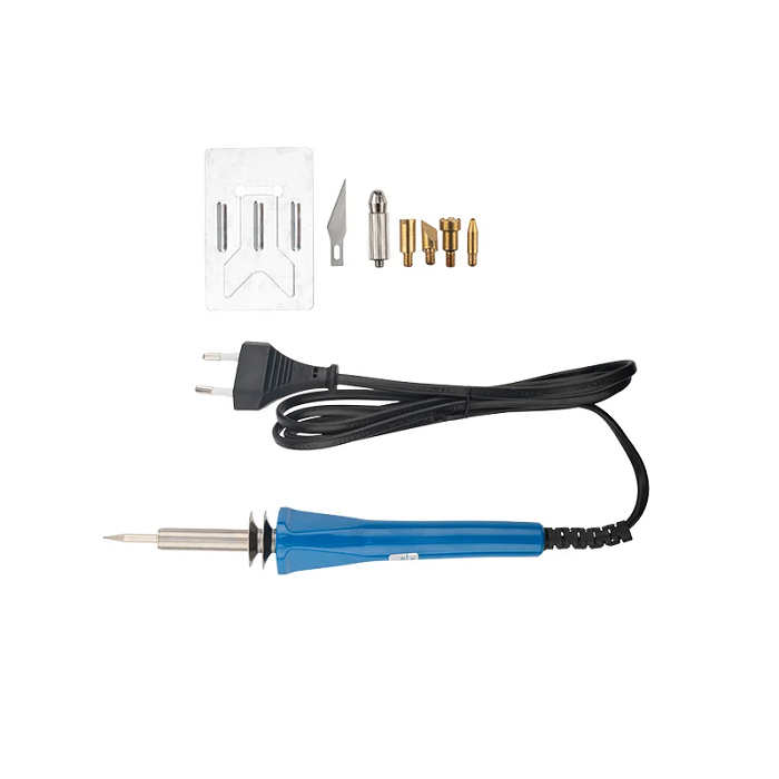 Паяльник-выжигатель с набором насадок представляет отличное решение для тех, кто стремится по максимуму использовать полезные приборы. Благодаря 6 различным насадкам устройство можно использовать в качестве паяльника, горячего ножа и выжигателя. С помощью этих сменных насадок можно создавать красивые картины, выжигая на дереве различные узоры, выполнять выжигание на изделиях из кожи, резать пластмассу, вырезать на воске или пенопласте и т.п. Все насадки закрепляются с помощью резьбового соединения.