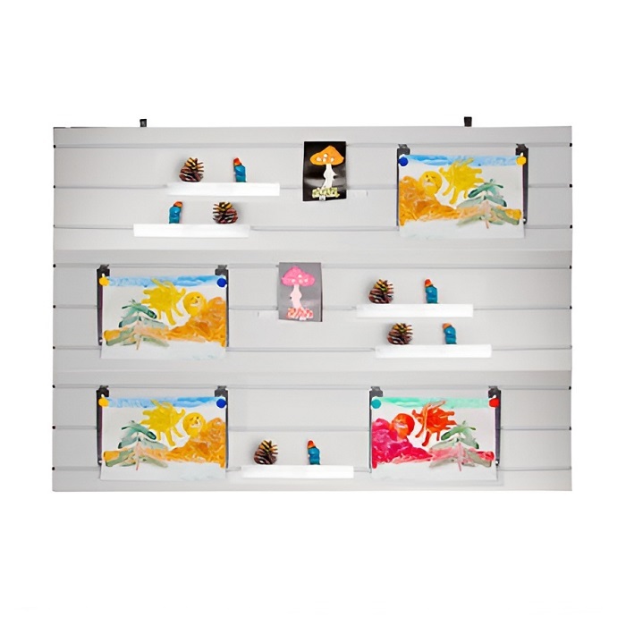 Стенд представляет собой ламинированный щит с пазами для крепления аксессуаров: набора полок, крюков, магнитных держателей и подвесок. Аксессуары вставляются в пазы щита и размещаются на стенде в удобном для экспозиции месте.