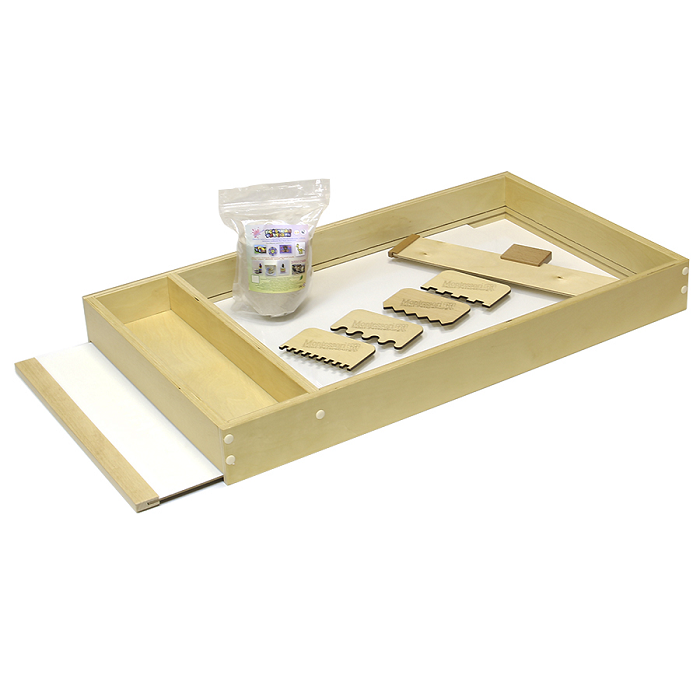 Большой деревянный ящик с прозрачным выдвижным дном. Прозрачное дно позволяет менять фон. Рисуем на песке или манке, используем при этом предметы, оставляющие следы.