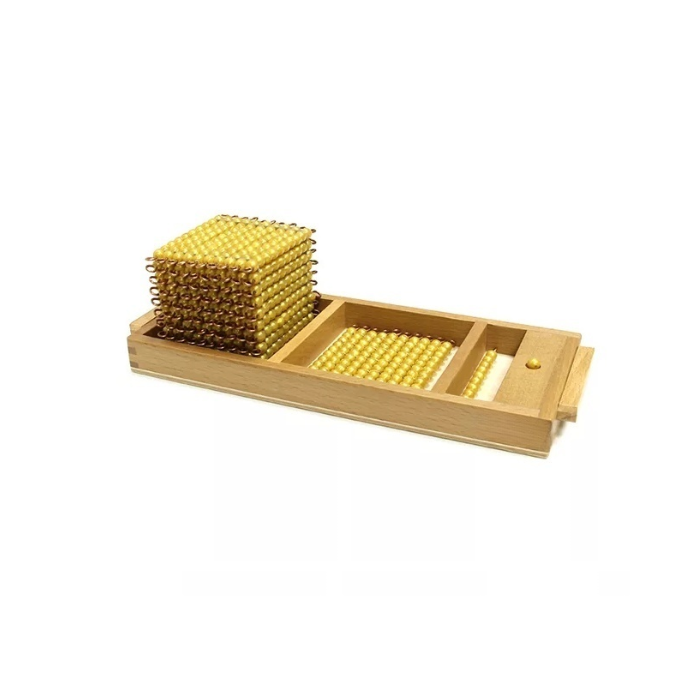 На конкретном материале, используя сенсорный опыт, ребёнок знакомится с количествами, соответствующими разрядам десятичной системы исчисления. Единица – одна бусина; десяток – стержень из десяти бусин; сотня – пластина из ста бусин; тысяча – куб из тысячи бусин. Впоследствии ребенок много упражняется с «банком золотого материала», самостоятельно манипулируя различными количествами каждого разряда.