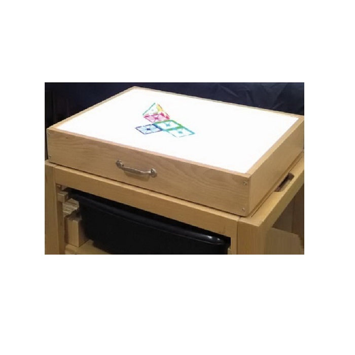 Ящик-столешница с нижней подсветкой дает детям простор для фантазийных проектов из собственных рисунков, аппликаций и песочных узоров.