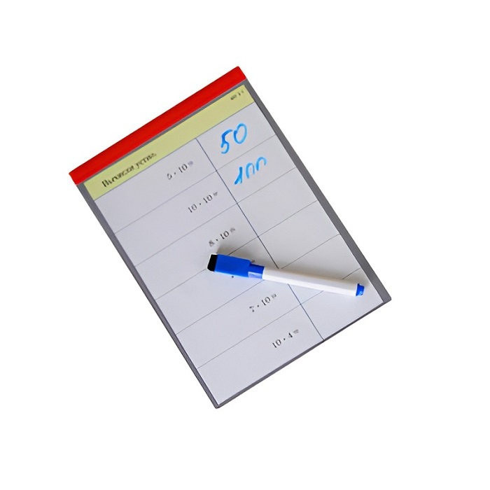 Планшет размером 150*210 мм изготовлен из пластика. На лицевой стороне планшета закреплена пленка, под которую может помещаться карточка с заданиями. Ответы записываются на пленке маркером на водной основе. Надписи можно стирать специальным ластиком, закрепленным в колпачке. Планшеты можно использовать с карточками, подготовленными самостоятельно. Размещение на оборотной стороне карточки заданий с ответами дает возможность учащимся самостоятельно проверить правильность решения, оценить свою работу и исправить ошибки. Кроме того, можно предложить учащимся самостоятельно составить задания.