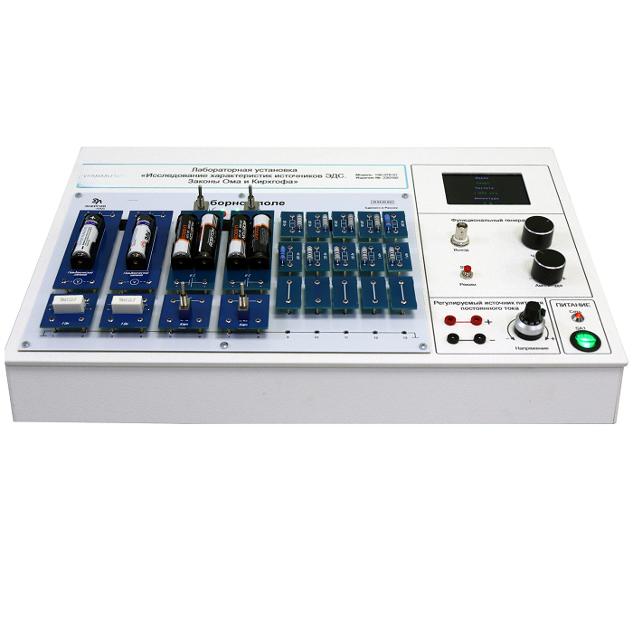 Учебная лабораторная установка «Исследование характеристик источников ЭДС. Законы Ома и Кирхгофа» предназначена для исследования характеристик источника ЭДС (ЭДС, внутреннего сопротивления) и экспериментальной проверки законов Ома и Кирхгофа для разветвленных цепей.