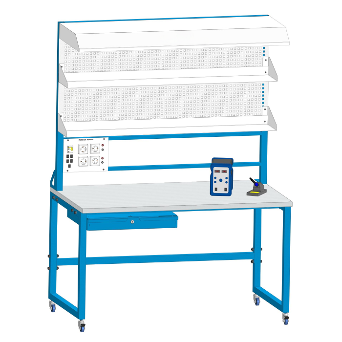 Стойка оснащена двумя полками и навесом со светильником, для освещения рабочей области. Задняя сторона стойки закрыта перфорацией из металла.