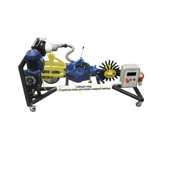 Стенд представляет собой секцию сеялки для посева свеклы, закрепленную на металлическом основании с электроприводом, вентилятором и панелью управления.