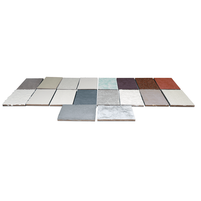 Образец штукатурки нанесен на деревянную табличку, закрепленную на композитной панели. В наборе представлены следующие виды штукатурной отделки: цементная штукатурка, гипсовая штукатурка, густая штукатурка, штукатурка сграффито, направленная штукатурка, декоративная цветная штукатурка, каменная штукатурка, фактурная штукатурка, структурная штукатурка, рельефная штукатурка, венецианская штукатурка, мраморная штукатурка, штукатурка «Флок». Количество образцов штукатурки - 16 шт. Большие панели с дополнительными образцами - 3 шт.