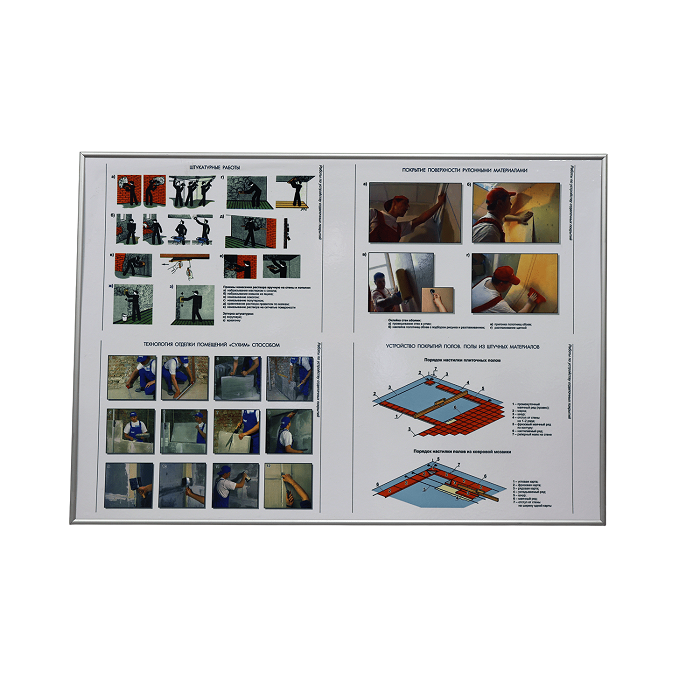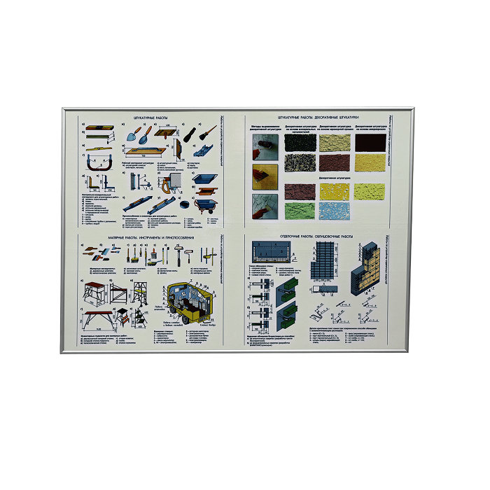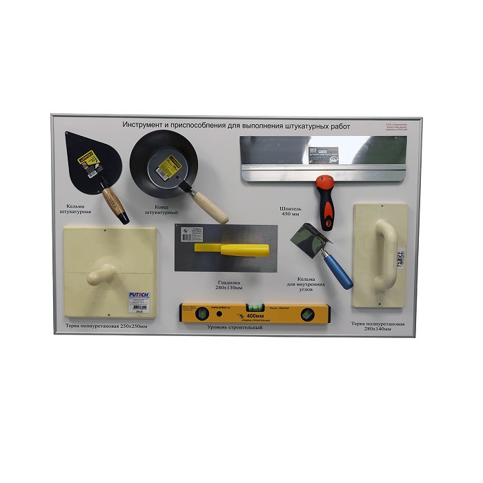 Планшет с инструментом и приспособлениями для выполнения штукатурных работ, предназначенных для демонстрации инструментов и приспособлений применяемых при выполнении штукатурных работ.